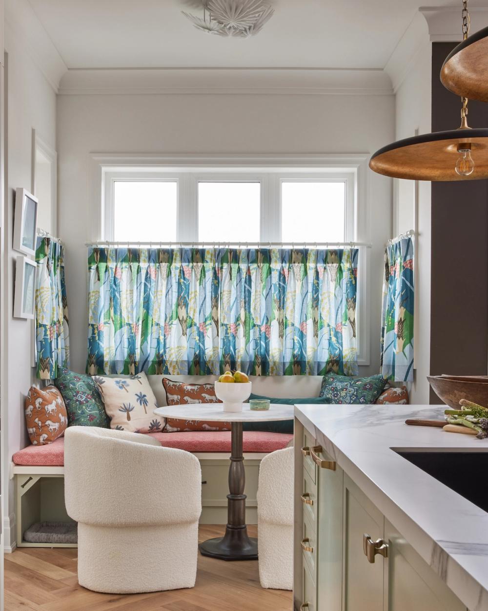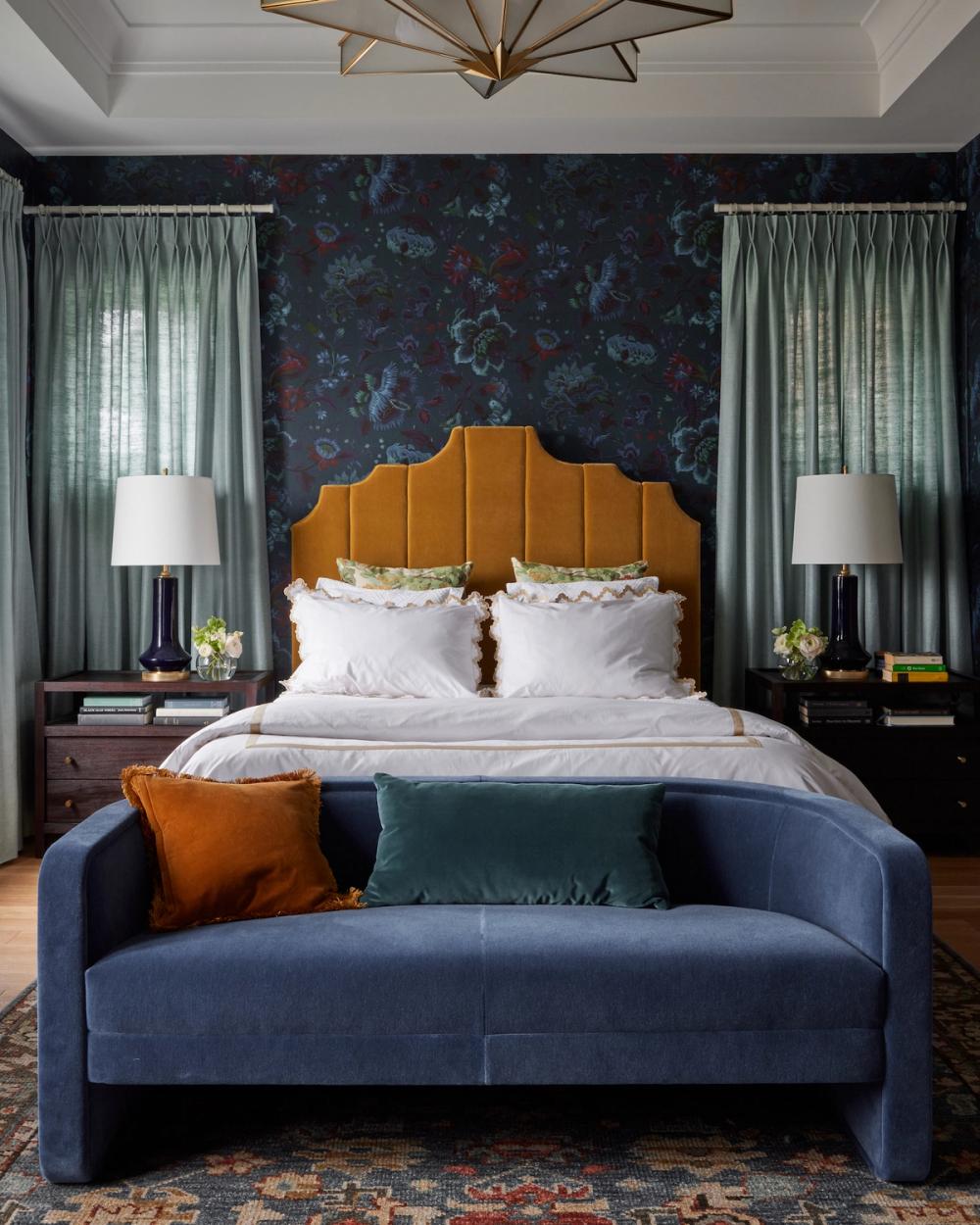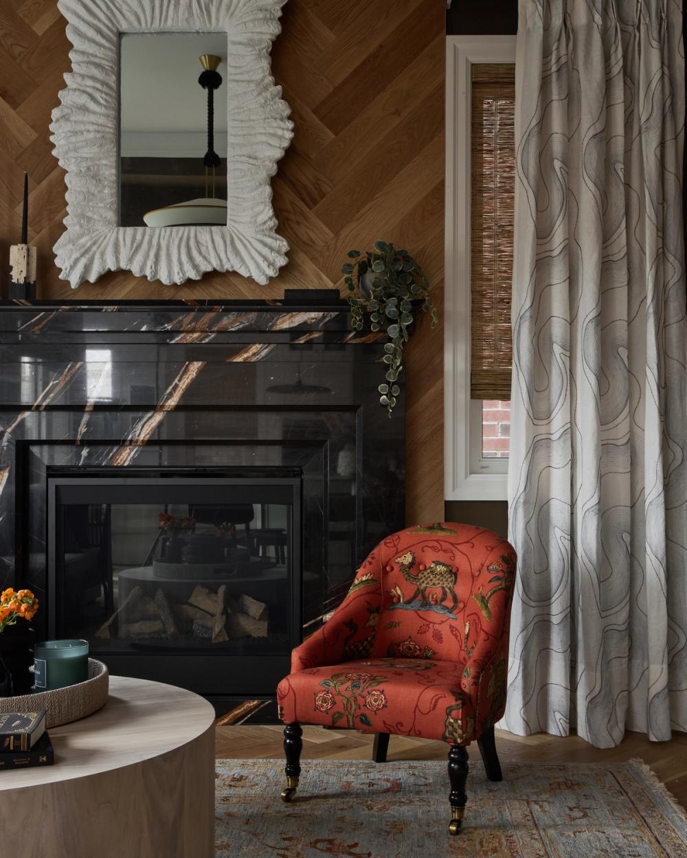 Modern bohemian luxury is imagined through chic smudged florals, deep veined marbles, and warm woods represented in jutes, wicker, and rope. A three-story home built during the height of the pandemic. With this shift in lifestyle in mind, the home was designed to maximize space and create zoned and desirable areas for family life, workplace, meditation and movement.