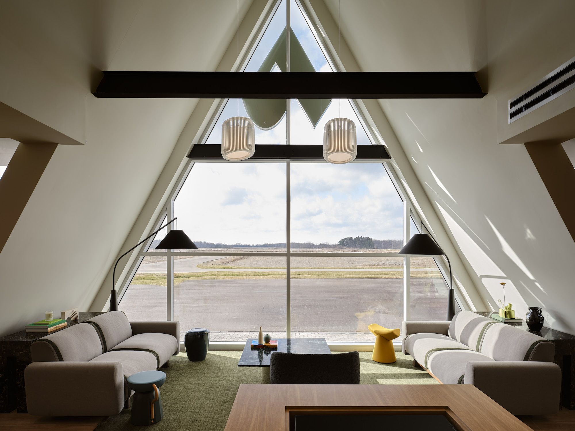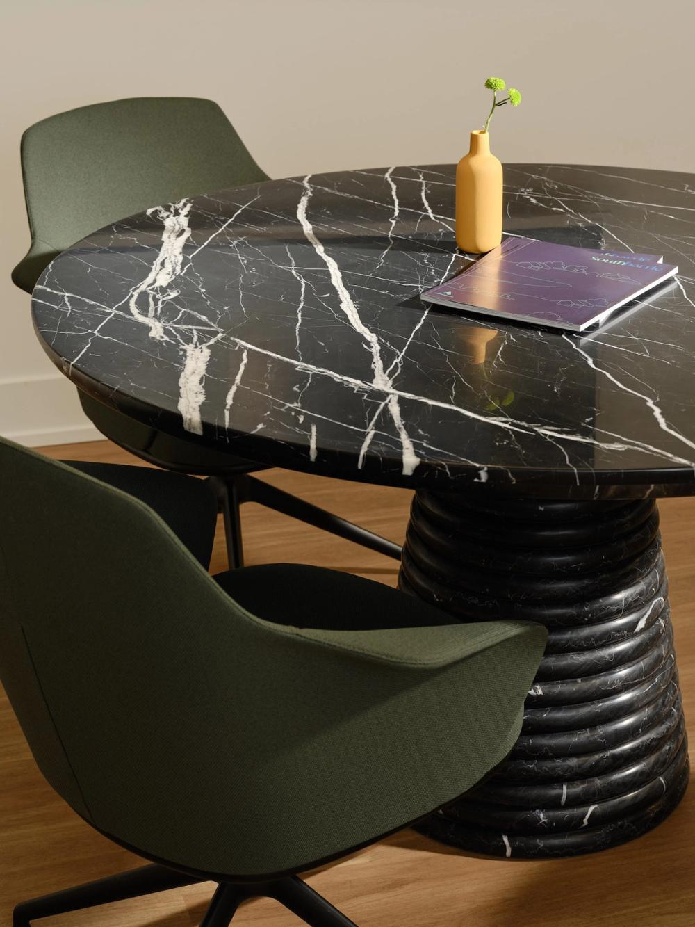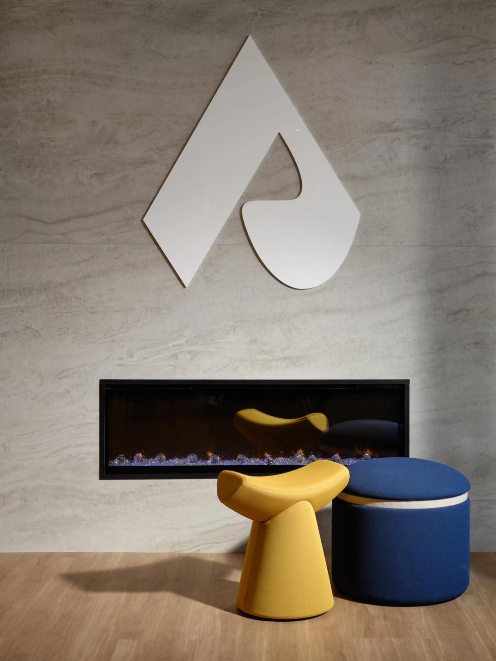 The centre’s uncommon style of architecture influenced the interiors to be outfitted in choice silhouettes of flared stools and cocoon-like loungers embracing the user.
