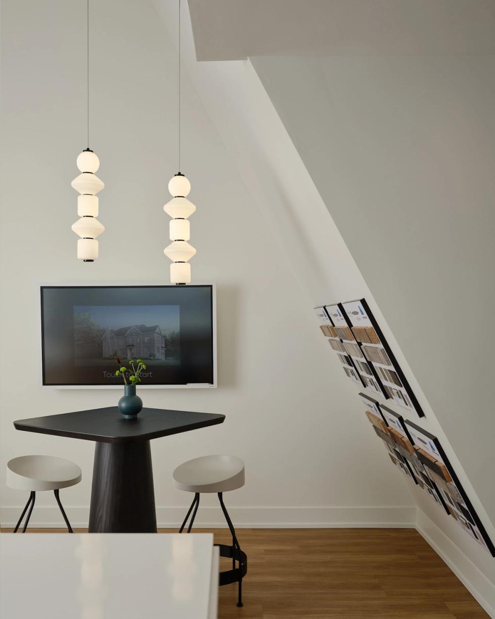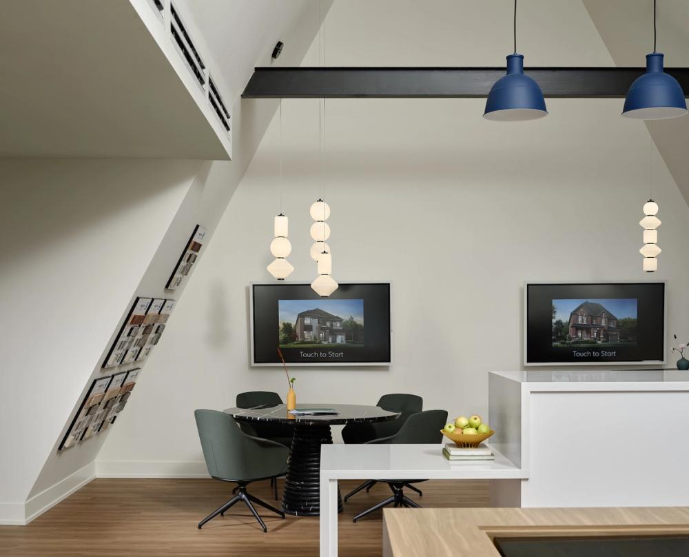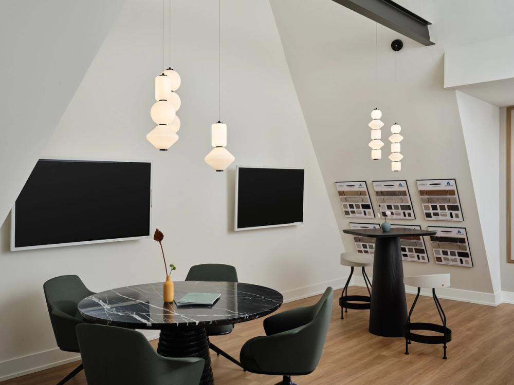 The main shell of this experience centre by BDG Quadrangle was designed with an A-frame roof which dates back to ancient Japan. The interiors allow for clear sightlines to client marketing and varied seating and table styles for client interactions.